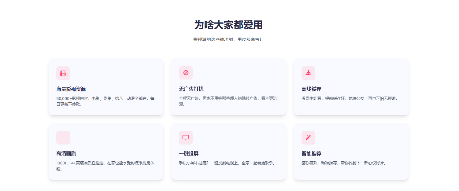 - 核心卖点:离线缓存、4K播放、智能推荐等