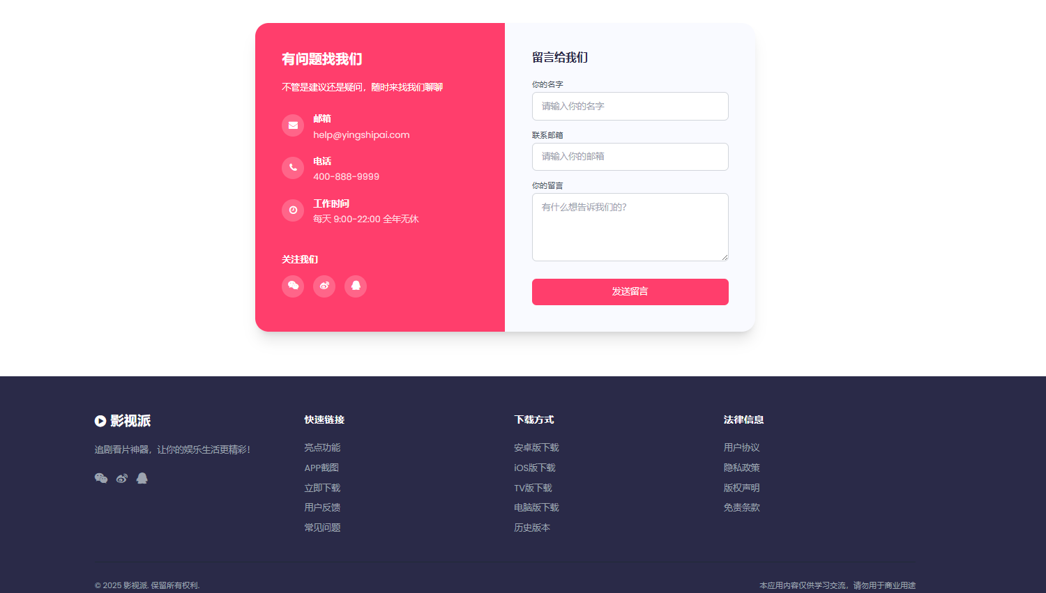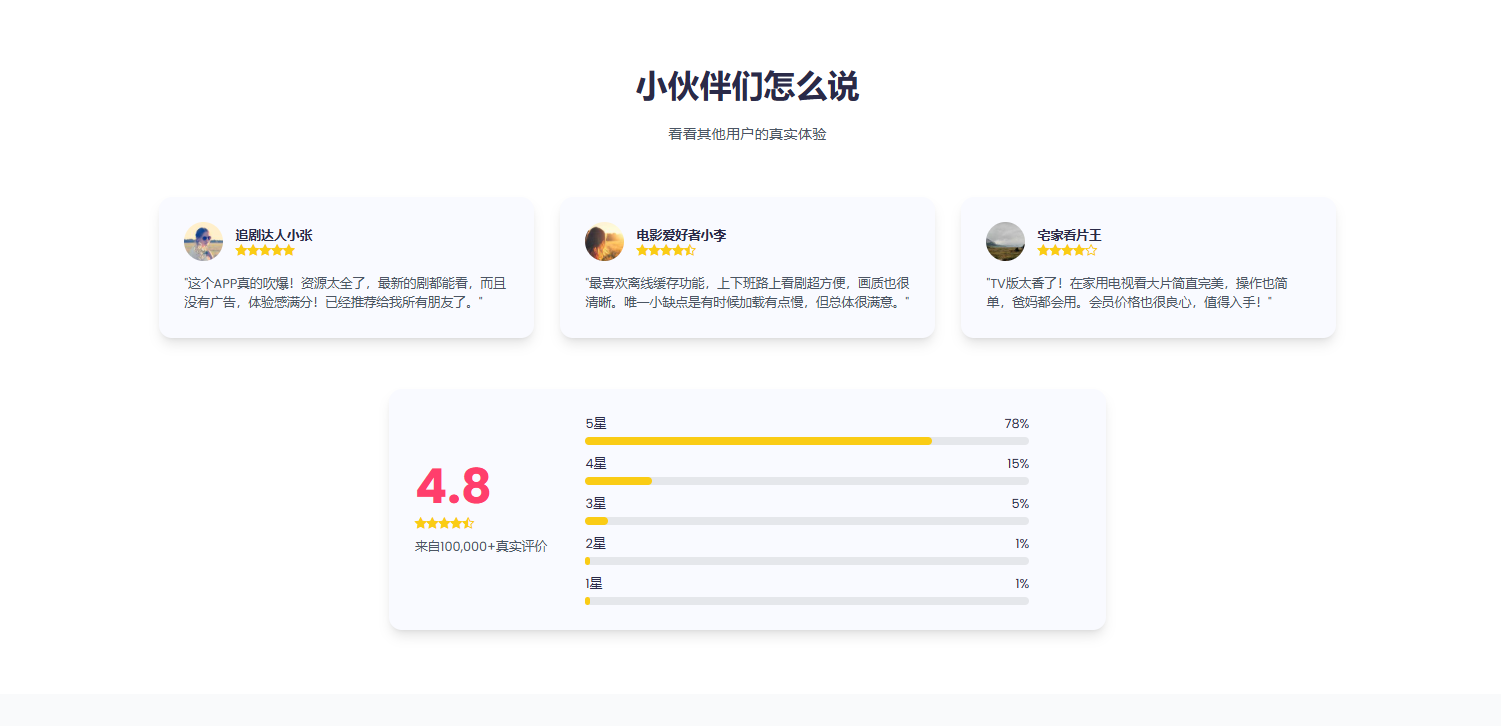 该页面设计现代活泼,色彩明快,交互丰富,适合作为影视类应用的官方宣传落地页,完整展示产品优势并引导用户下载转化。