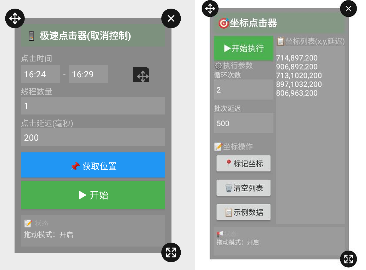- 双悬浮窗设计:控制窗(设置参数)与标记窗(定位坐标)分离,互不干扰。