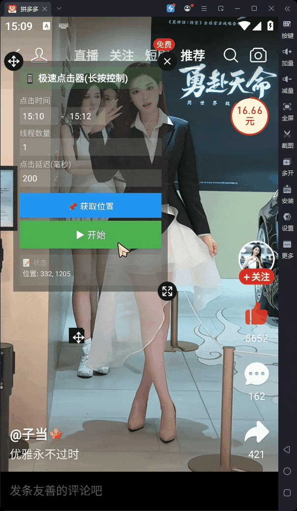 - 一键获取坐标:在控制窗点击“📌 获取位置”,记录十字准星右上角坐标,后续点击精准落在此处。