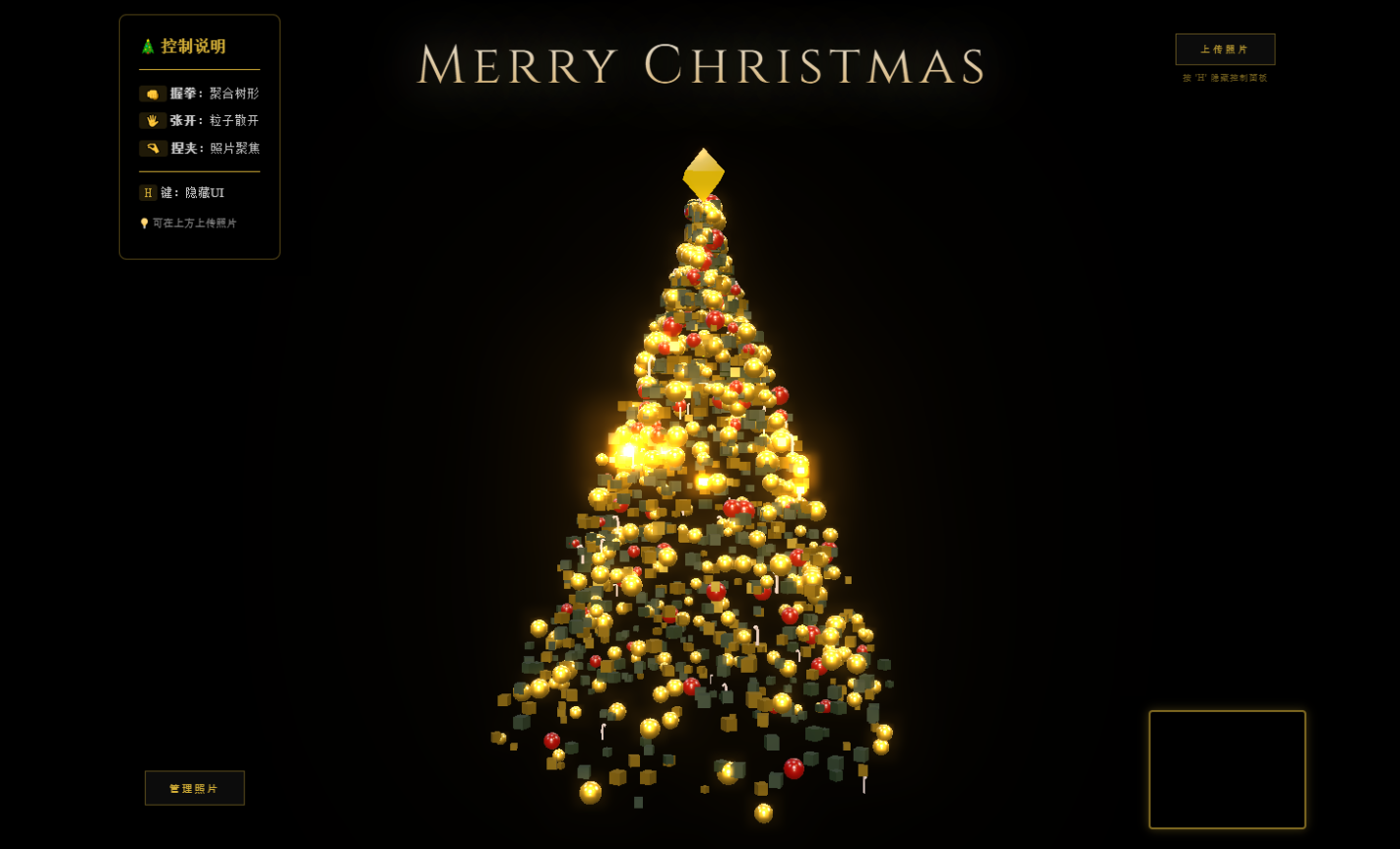 - 动态粒子系统:由1500+个装饰粒子(礼盒、星星、雪花)构成3D树形结构