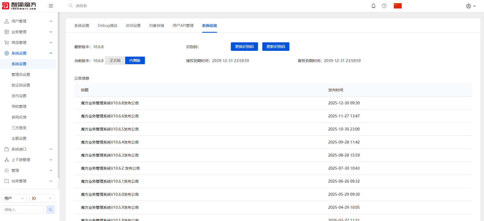 登录后台→系统设置→系统信息,输入任意授权码(如IDCSMART_2026)即可激活,无需官方验证。 - 版本更新机制