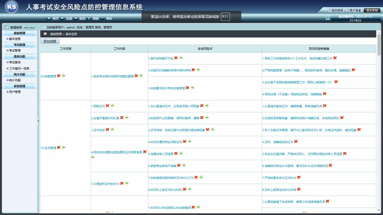 该系统适用于人事考试机构进行安全风险点的系统性防控管理,确保考试流程安全规范,主要功能特点如下: