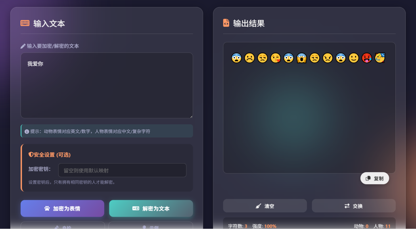 - 实时统计显示字符数、加密强度、表情分类