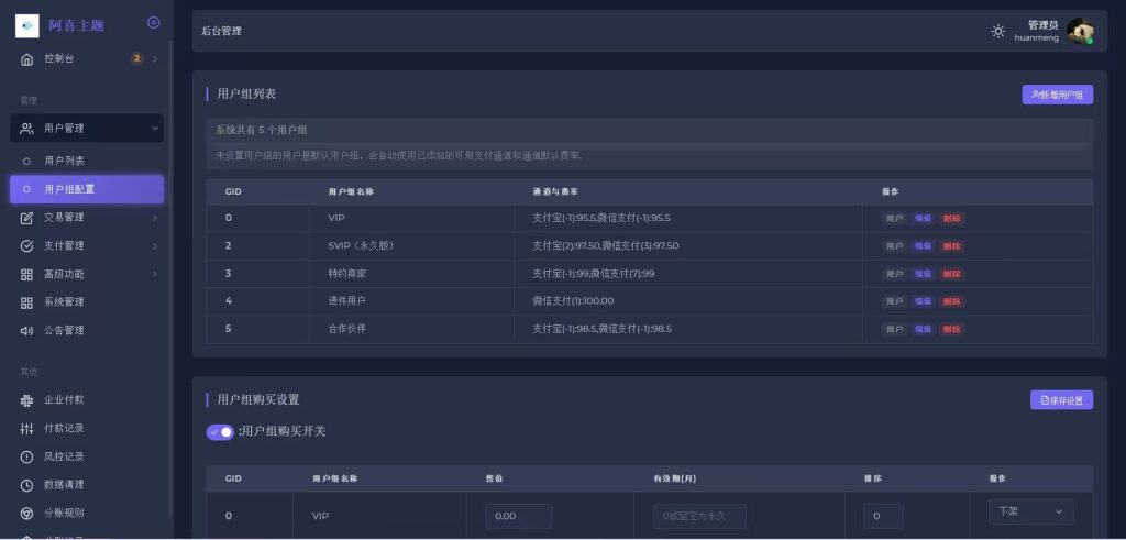 用户中心:商户管理后台,包含订单管理、资金管理等功能