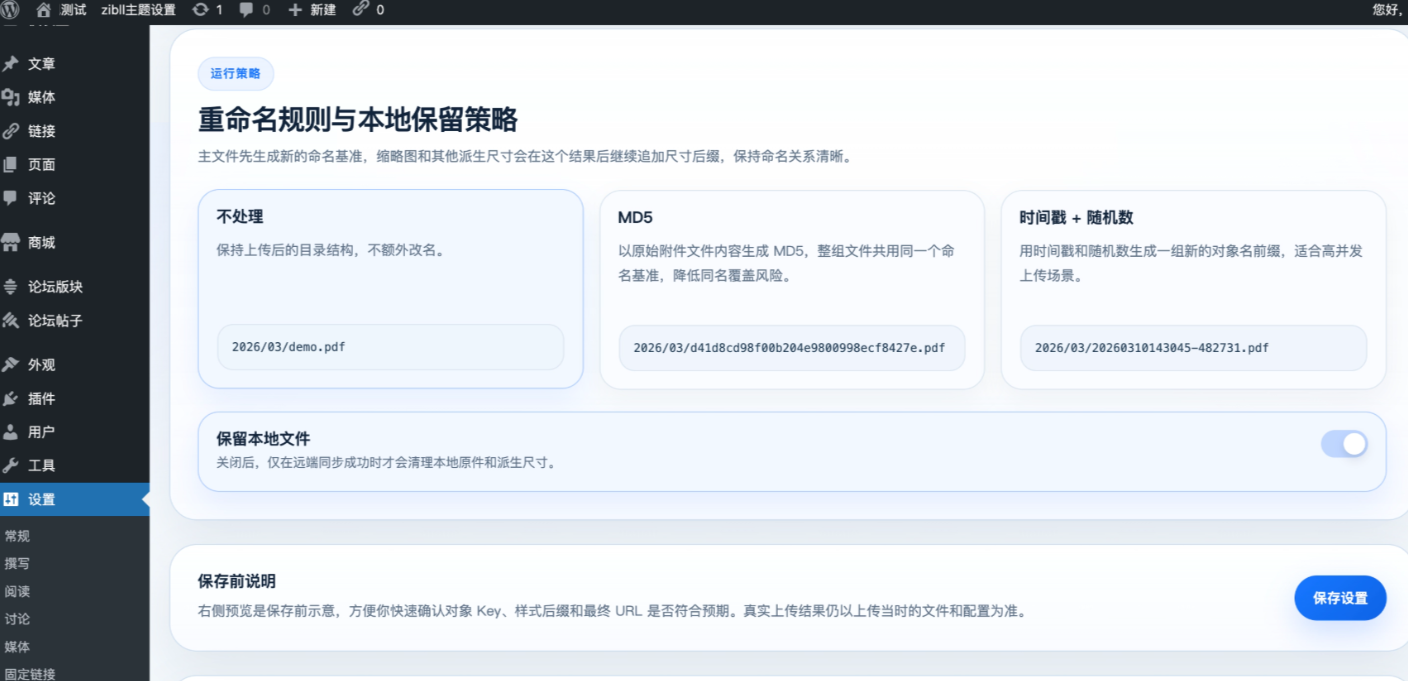 - 防重命名策略:提供不处理、MD5、时间戳 + 随机数三种重命名方式,避免同名文件覆盖,派生尺寸也会基于主文件命名。