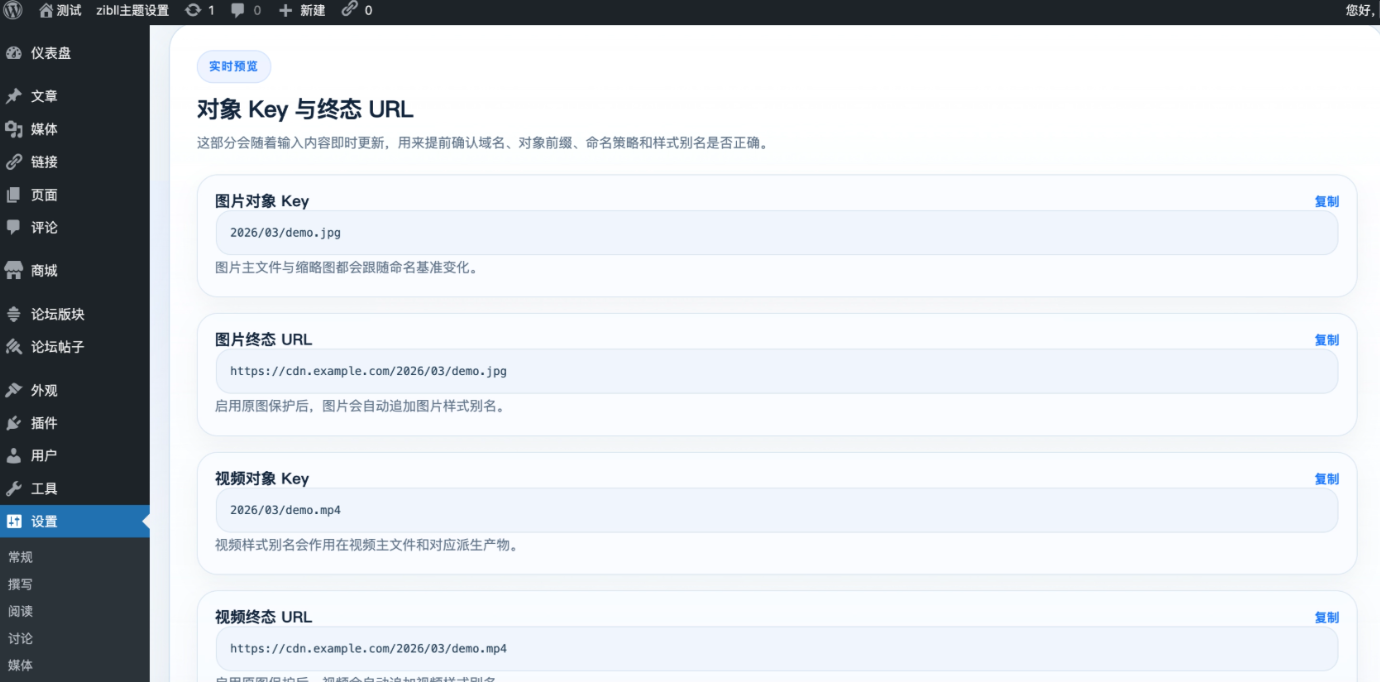 - 配置灵活:支持自定义对象前缀、HTTPS 开关、本地文件保留策略、私有链接有效期等。