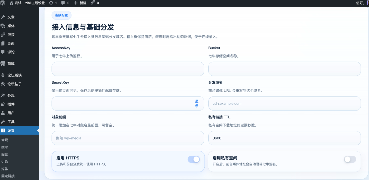 - URL 重写与私有签名:前台输出的媒体 URL 自动替换为七牛域名;支持私有空间,自动生成带有效期的签名链接。