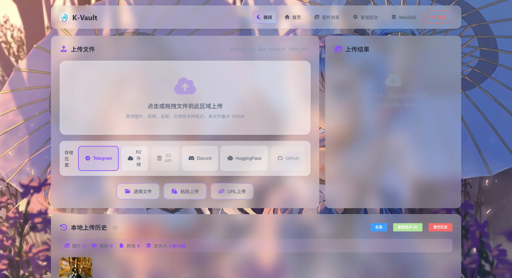 - 多存储后端:支持 Telegram、Cloudflare R2、S3 兼容存储、Discord、HuggingFace、WebDAV、GitHub。
