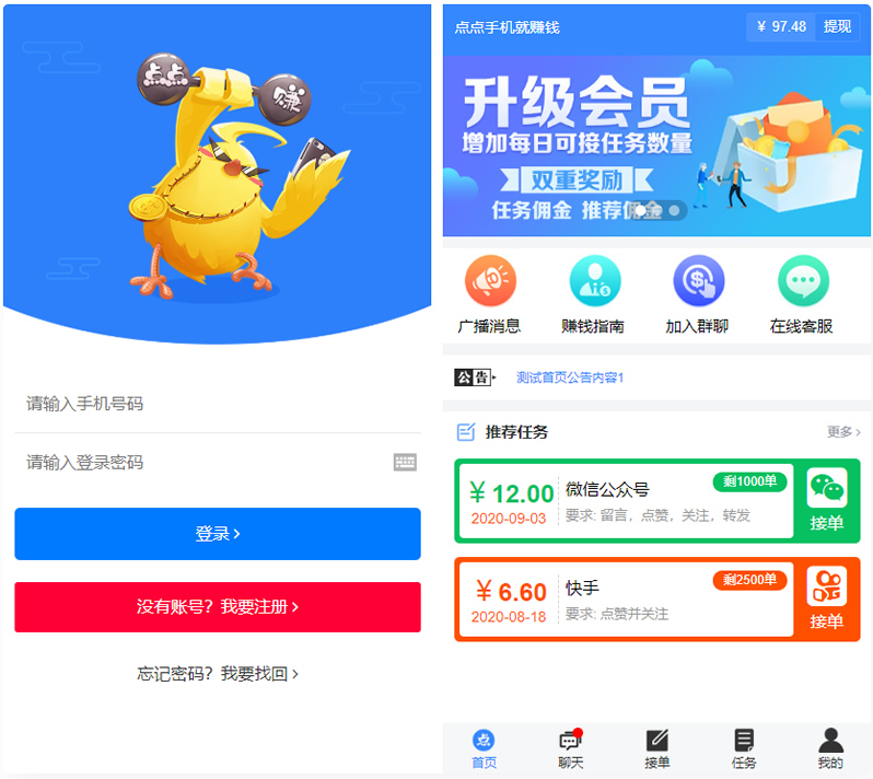 这款全新蓝色UI点点手机赚钱系统提供完整源码,采用Nginx 1.18.0、PHP 5.6和MySQL 5.5部署,支持前台任务测试和后台管理,附带聊天室功能(需PHP 7.0+),适用于快速搭建手机赚钱平台,操作简便,适合创业或副业尝试。