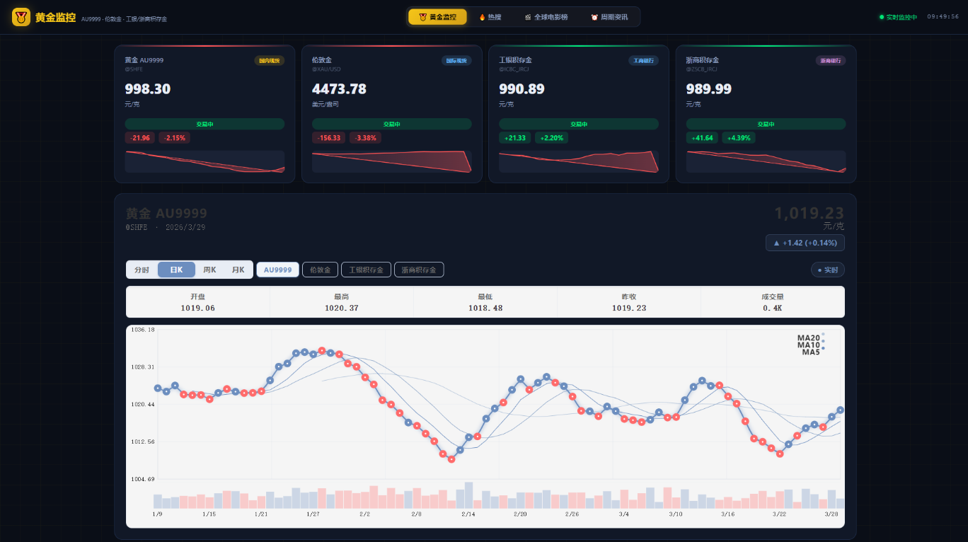 - 实时行情展示:提供AU9999、伦敦金、工银积存金、浙商积存金四大品种的实时K线图