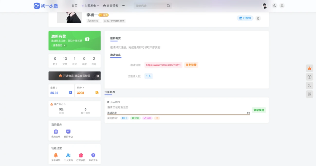 - 侧边栏入口:用户中心页面生成“邀新有奖”快捷入口,带图标和描述。