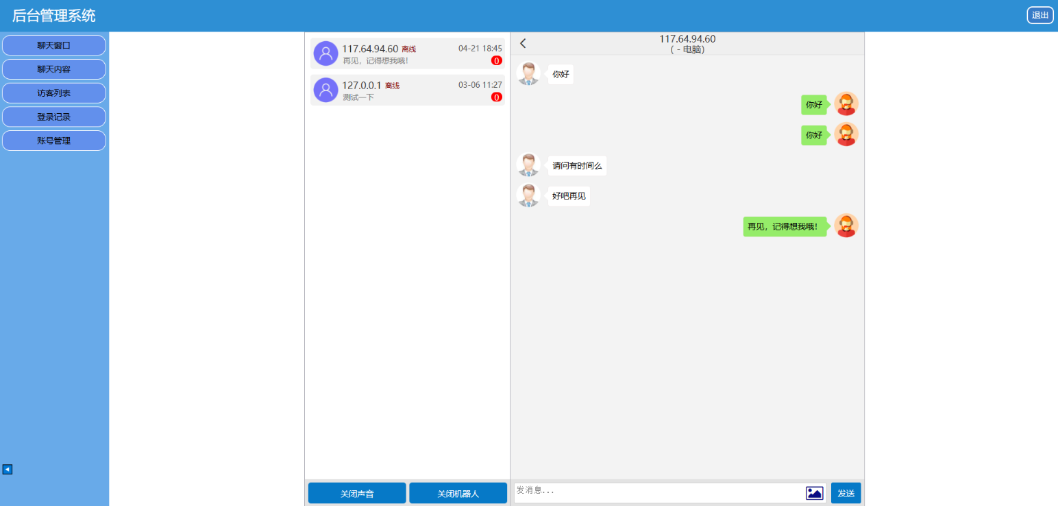 PHP在线客服系统3.0防黑版,支持文字图片发送、按IP识别访客。后台可查看访客状态,首次会话有公告提示,机器人模式可开关且回复内容可自定义。具备防注入、无后门等安全特性,亲测适用于nginx + PHP5.6 + MYSQL5.6环境。