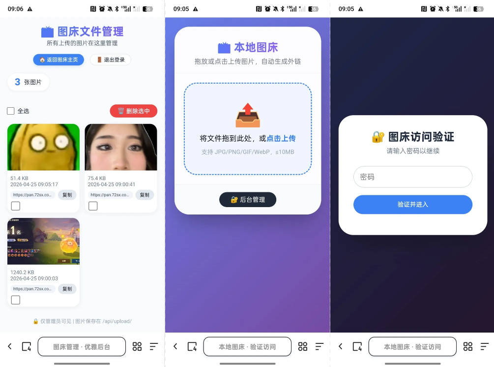 这是一套轻量级、自托管的个人图床系统,核心特色是“多平台外链 + 本地备份 + 密码后台”,无须数据库,适合快速部署、分享图片并集中管理本地文件。前端访问密码与后台管理密码分离,兼顾了公开分享与安全维护的双重需求。