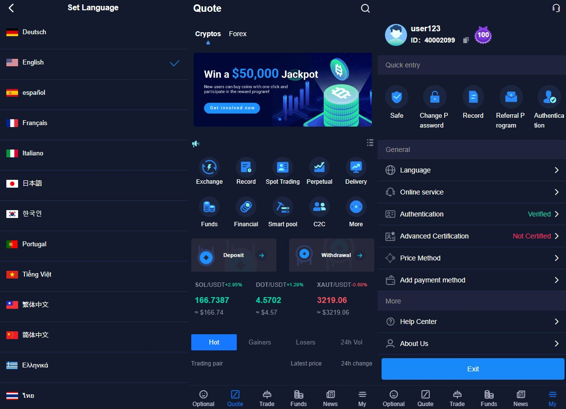 本系统为支持PC端与H5移动端双端同步运行的综合性数字资产交易平台,集成股票、外汇、区块链资产三大交易板块。当前版本已开放外汇交易与区块链资产交易功能,并预留股票交易模块接口。系统采用十三国语言支持,覆盖全球主要金融市场用户群体。