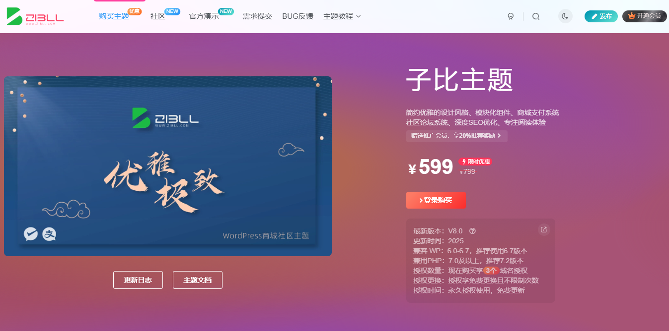 专为阅读类网站设计的开心免授权Zibll子比主题V8.0+ACG美化插件,支持付费阅读、付费下载、付费视频、VIP系统、模块化编辑,适配WP6.8,提供多种布局和显示效果,优化阅读体验,助力内容创作者高效运营。